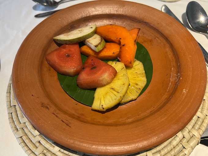 フルーツのソテーは毎朝の定番、白湯と共に提供されます。